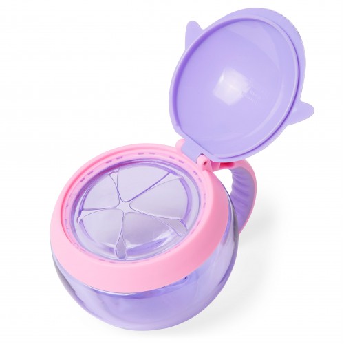 Šikovný nápad na cesty. Nádoba má viečko, ktoré po otvorení drží, pred vysypaním obsahu ho chránia pružné lamely, ktoré pustia detskú ručičku dovnútra, ale nepustia desiatu von. Nádoba je priehľadná, aby sa mohla zavčasu doplniť. Na boku je praktické uško v detskom rozmere, pomocou ktorého možno nádobu pripevniť aj na kočík či tašku. 0% BPA, 0% PVC, bez ftalátov. Obsah: 222 ml. Priemer: 10 cm