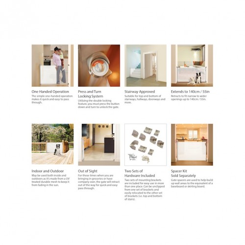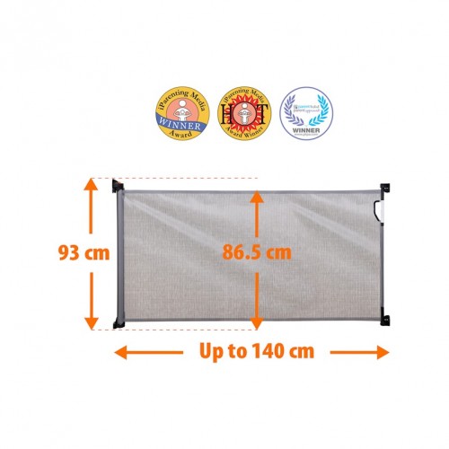 Táto zaťahovacia zábrana sa hodí pre otvory až do 140 cm a poskytuje praktickú bariéru pre všetky druhy rôznych šírok a keď sa nepoužíva, šikovne sa zasunie späť.
