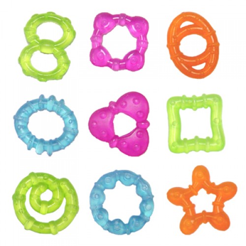 Vyrobené z bezpečného materiálu. Zaoblené tvary a špeciálne vybrané farby pomáhajú dieťatku cvičiť uchytenie predmetov do dlane, prechytenie z ručičky do ručičky a poznávanie farieb. Možné použiť aj ako chladiacu hryzačku. V období prerezávania zúbkov zmierni bolesť ďasien. Hryzačka je plnená destilovanou vodou.